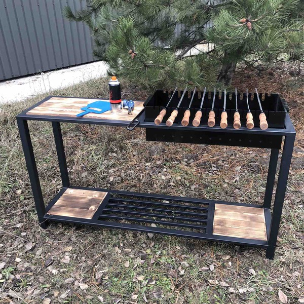 Загальні габарити: 1500×400×820 мм (з лівої частини із жаровнею – 910 мм)Жаровня: 700×310×200 ммТовщина металу: 4 мм (надійність і довговічність)Пази під шампури: 11 та 10 низькихФункціональна конструкція – можливість використання як обідньої зониВага: 38 кг