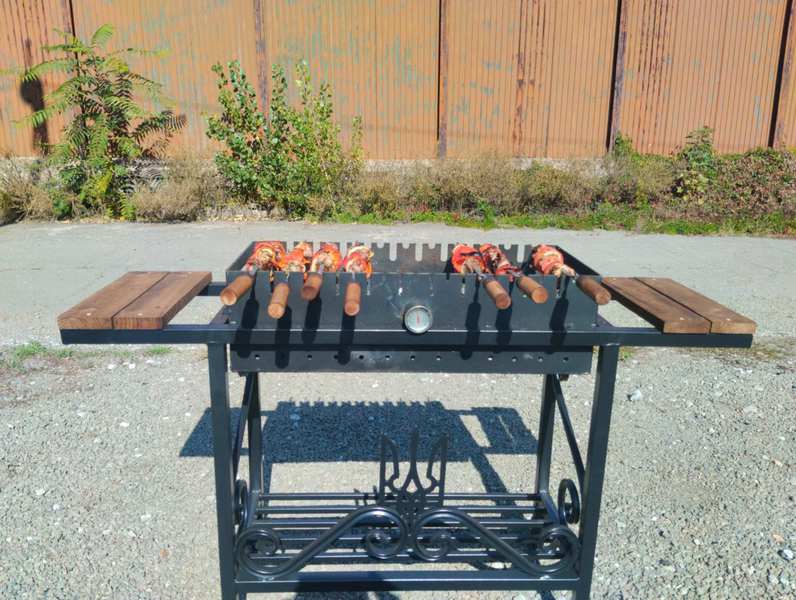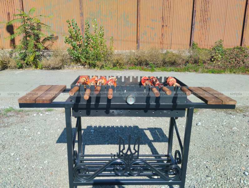 Габарити каркасу: 1300×380×760 ммЖаровня (знімна): 700×300×200 ммМетал жаровні: 4 мм (стійкий до високих температур)Два рівні для шампурів – місткість 10-11 шампурівГрадусник – точний контроль температуриДизайн "Герб" – унікальне оформлення